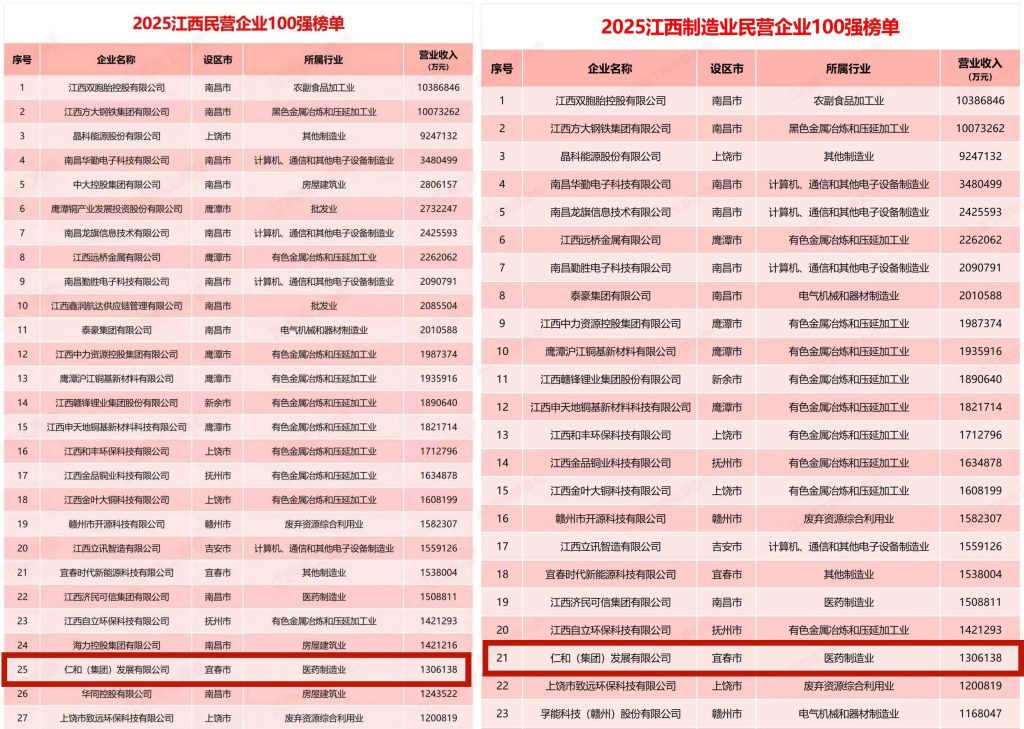 近日,2025江西民營企業100強系列榜單在南昌正式揭曉。仁和(集團)發展有限公司憑借穩健的經營業績與卓越的綜合實力,成功入圍“2025江西民營企業100強”榜單,位列第25位;同時入選“2025江西制造業民營企業100強”,位居第21位。此次蟬聯百強榜單,彰顯了仁和集團在復雜經濟環境下的強勁發展韌性與行業領先地位。